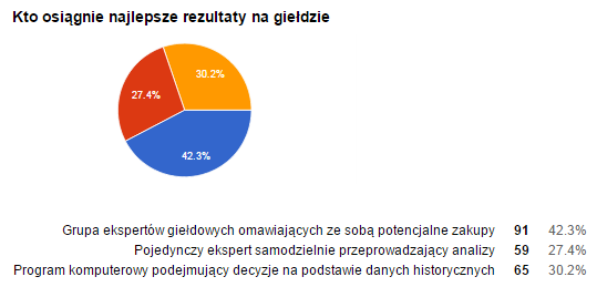 Skoro tak, to nie ma powodu, dla którego ekspert giełdowy (guru) lub nawet ich grupa mieliby osiągnąć lepsze wyniki inwestycyjne niż wzór matematyczny. Byłem ciekaw jakie jest wasze spojrzenie na ten temat dlatego dodałem odpowiednie pytanie w ankiecie. Oto wyniki: