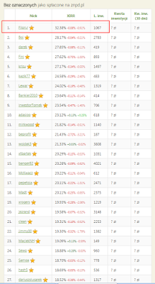 Od czasu opracowania kryteriów oceny pożyczkobiorców korzystałem z tej metody przez ok. 3 kolejne lata. W tym czasie udzieliłem ponad 1000 pożyczek. Mimo iż obecnie od dłuższego czasu pozostaję bierny i przerzuciłem się na inwestowanie na giełdzie, to aktualna tabela z wynikami wciąż plasuje moje konto na pierwszym miejscu w całej Polsce z zyskiem rocznym na poziomie 32%.
