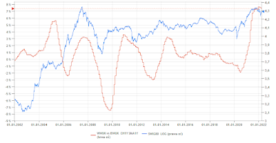 Okazuje się, że w przeszłości mieliśmy 4 tego typu szczyty na wskaźniku i każdy z nich był powiązany 1:1 ze szczytem na giełdzie (sWIG80). Ciężko mówić tu o zdolności wyprzedzania bessy, gdyż tylko 2 na 4 sygnały pojawiły się przed jej rozpoczęciem, ale już jako potwierdzenie, że spadki, które obserwujemy, rzeczywiście są bessą, a nie tylko korektą w trakcie hossy, wskaźnik sprawdza się znakomicie.