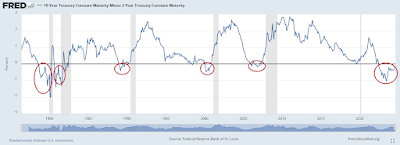 Czerwone elipsy na powyższym wykresie oznaczają okresy gdy krzywa rentowności była odwrócona. Szare pionowe obszary to z kolei okresy gdy gospodarka USA była w recesji.
